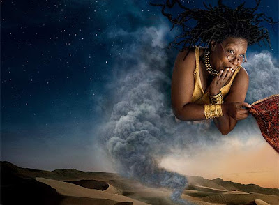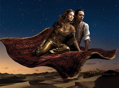 A atriz e cantora Jennifer Lopez ao lado de seu marido, o cantor Marc Anthony, interpretou a cena da princesa Jasmine e Aladdin voando no tapete mágico em “Onde Um Mundo Todo Novo Espera” (Where a Whole New World Awaits), do clássico “Aladdin”, que também foi homenageado com outra fotografia que trazia a atriz Whoopi Goldberg, que deu vida ao gênio mágico da lâmpada.