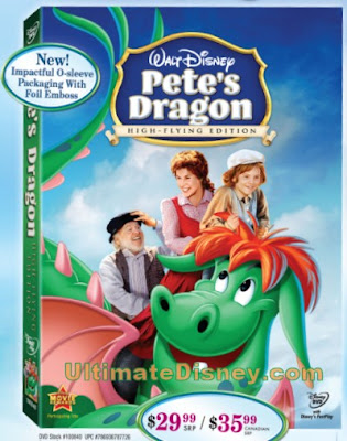 O site UltimateDisney.com acaba de divulgar a arte oficial da capa do clássico Disney, “Meu Amigo o Dragão“ (Pete’s Dragon: High-Flying Edition), que chega as lojas norte-americanas em DVD no dia 18 de agosto de 2009. De acordo com o site, o grande destaque do DVD são os extras que incluem uma sequencia de storyboard deletada com Terminus & Hoagy (com raros diálogos demo), o featurette “Efeito Brazzle Dazzle: A Magia de um filme Disney” narrado por Sean Marshall (Pete), quatro canções demos (incluindo uma deletada interpretada por um personagem cortado), gravações promocionais de quatro músicas do filme e uma canção conceitual demo “Boo Bop Bopbop Bop (Eu te Amo, Também)”. O valor do produto será de $29.99, e ele será acompanhado por uma luva especial, além do formato Disney FastPlay.