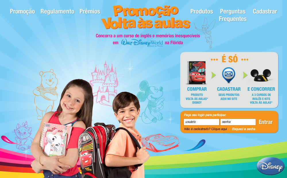 A Disney lança pela primeira vez uma campanha nacional voltada aos quase 50 milhões de estudantes brasileiros. Quem participar da promoção Volta às Aulas Disney, que se estende até 15 de março, concorrerá a cursos de inglês e memórias inesquecíveis em Walt Disney World Resorts, na Flórida, e a 5 kits de produtos escolares Disney.