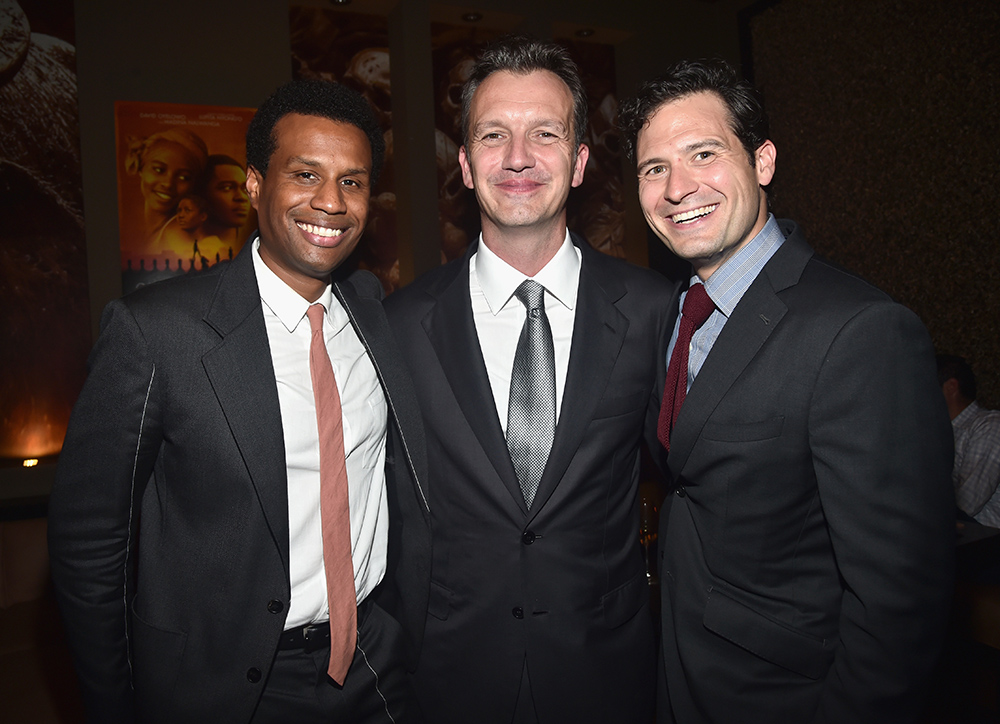 TORONTO, ON – SEPTEMBER 10: (L-R) Executive Vice President of Production, The Walt Disney Studios, Tendo Nagenda, President of Walt Disney Studios Motion Picture Production, Sean Bailey and VP, Production, The Walt Disney Studios, Louie Provost at the world premiere of Disney’s “Queen of Katwe” at Roy Thompson Hall as part of the 2016 Toronto Film Festival where the cast, filmmakers and real life stars received a standing ovation. The film, starring David Oyelowo, Oscar winner Lupita Nyong’o and newcomer Madina Nalwanga, is directed by Mira Nair and opens in U.S. Theaters September 23, 2017. (Photo by Alberto E. Rodriguez/Getty Images for Disney ) *** Local Caption *** Tendo Nagenda; Sean Bailey; Louie Provost